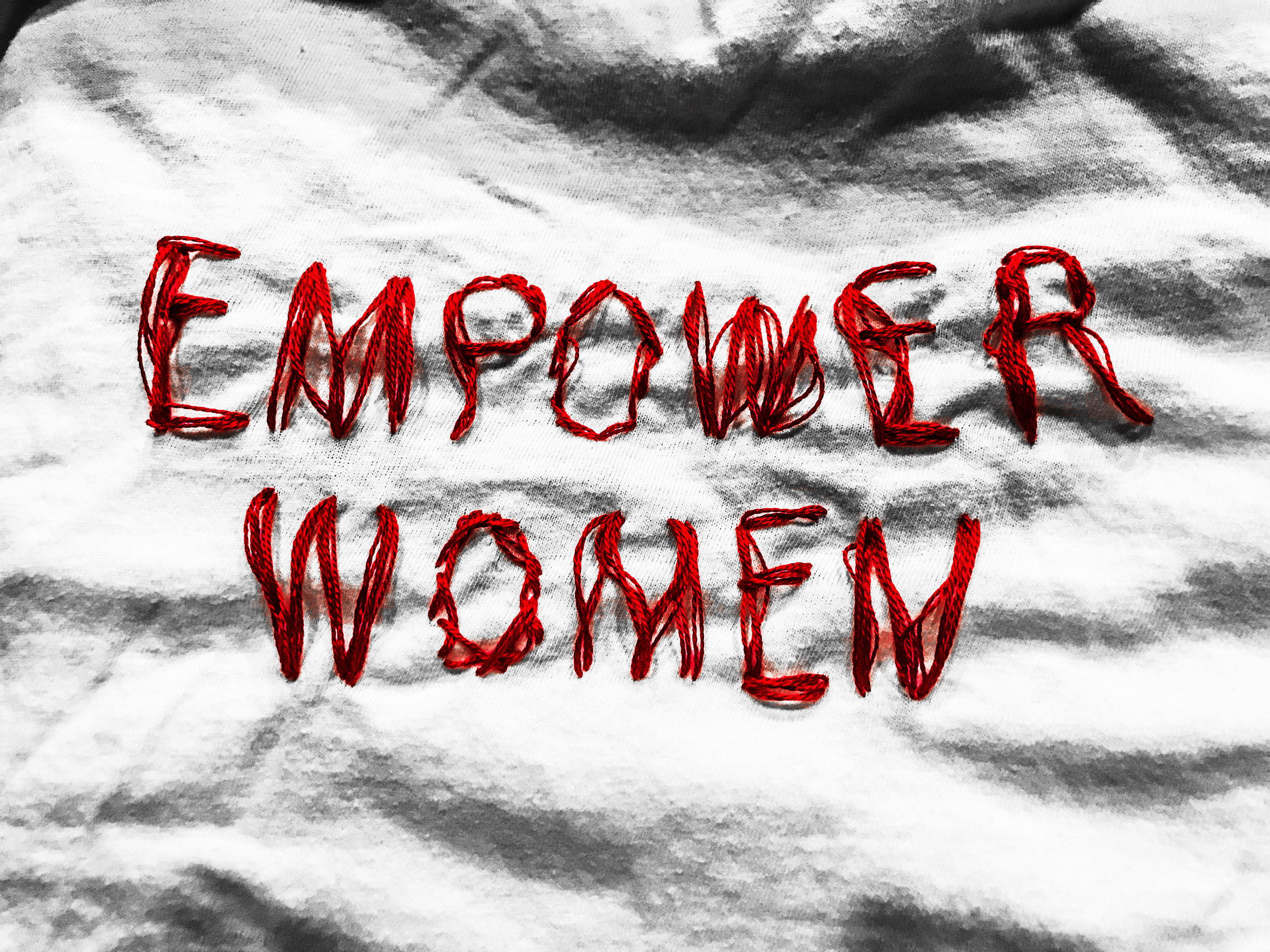 Poster 1 / Preparing the earth with red thread and felt. The continents were traced in Illustrator and printed via the Cricut machine. And below is the big picture of the poster, with the words 'Empower Women' stitched on a white T-shirt.