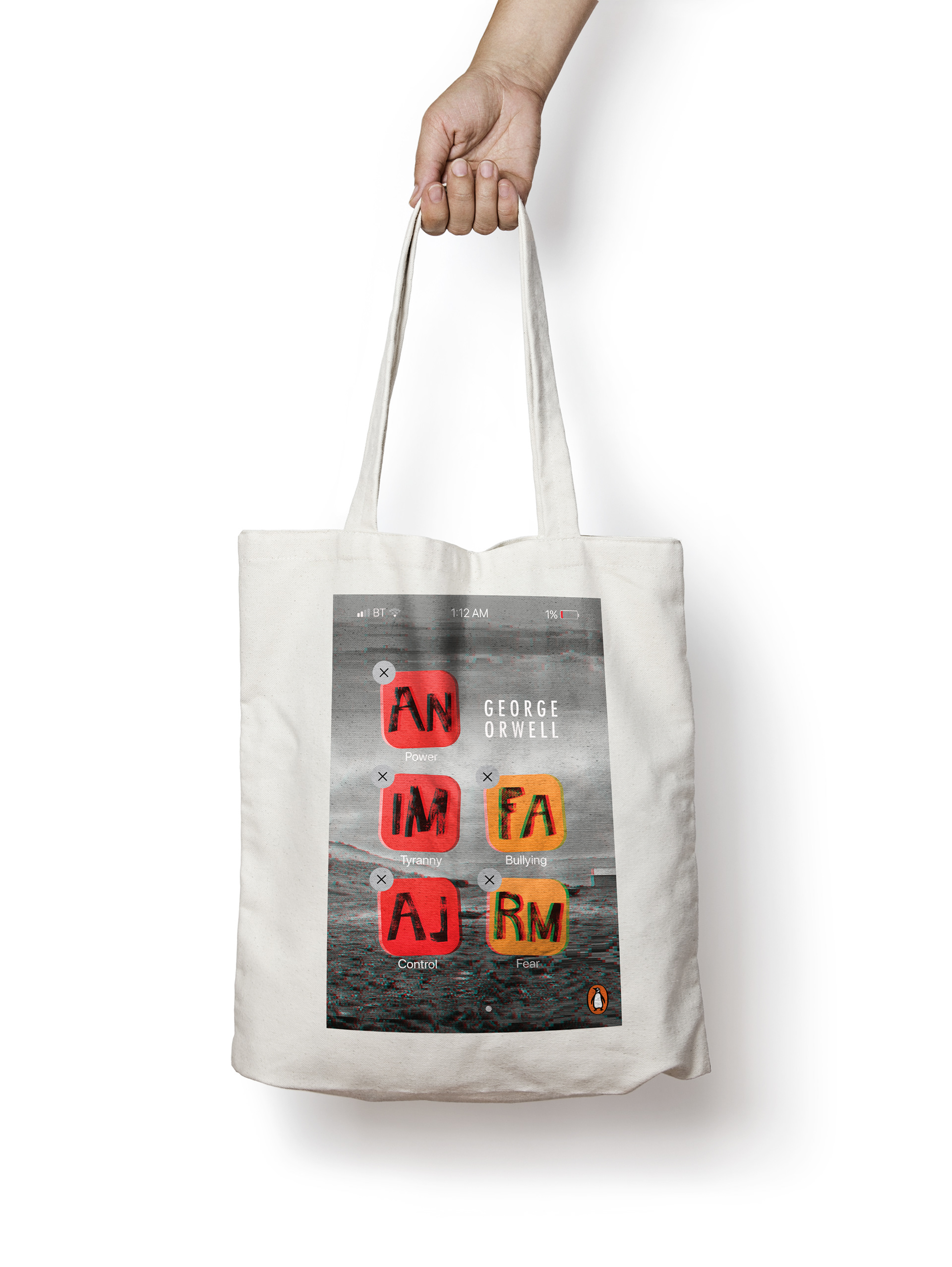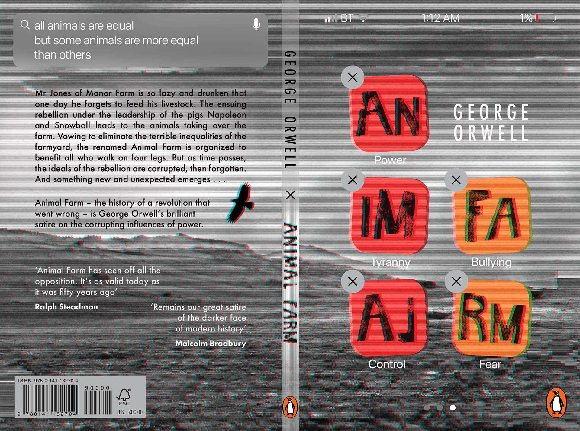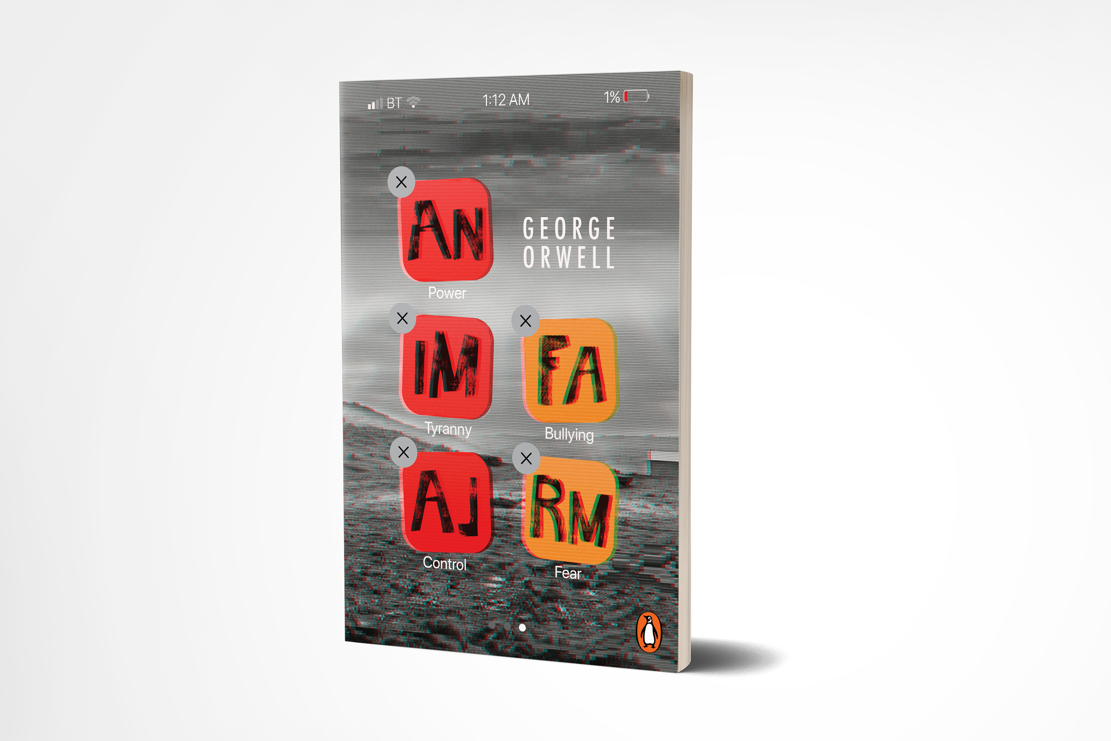 I was able to target the YA audience thanks to the following attributes, which I had isolated during the research process: large hand-rendered title and color contrasts (here, black and white versus strong colors), eye-catching tones, the use of typographic imagery and the conceptual approach of reproducing an app screen on the print cover. Using the glitch technique, a current design trend, further linked to the YA audience while communicating the satirical allegory and portrayal of Soviet totalitarianism portrayed throughout this world famous dystopian novel.