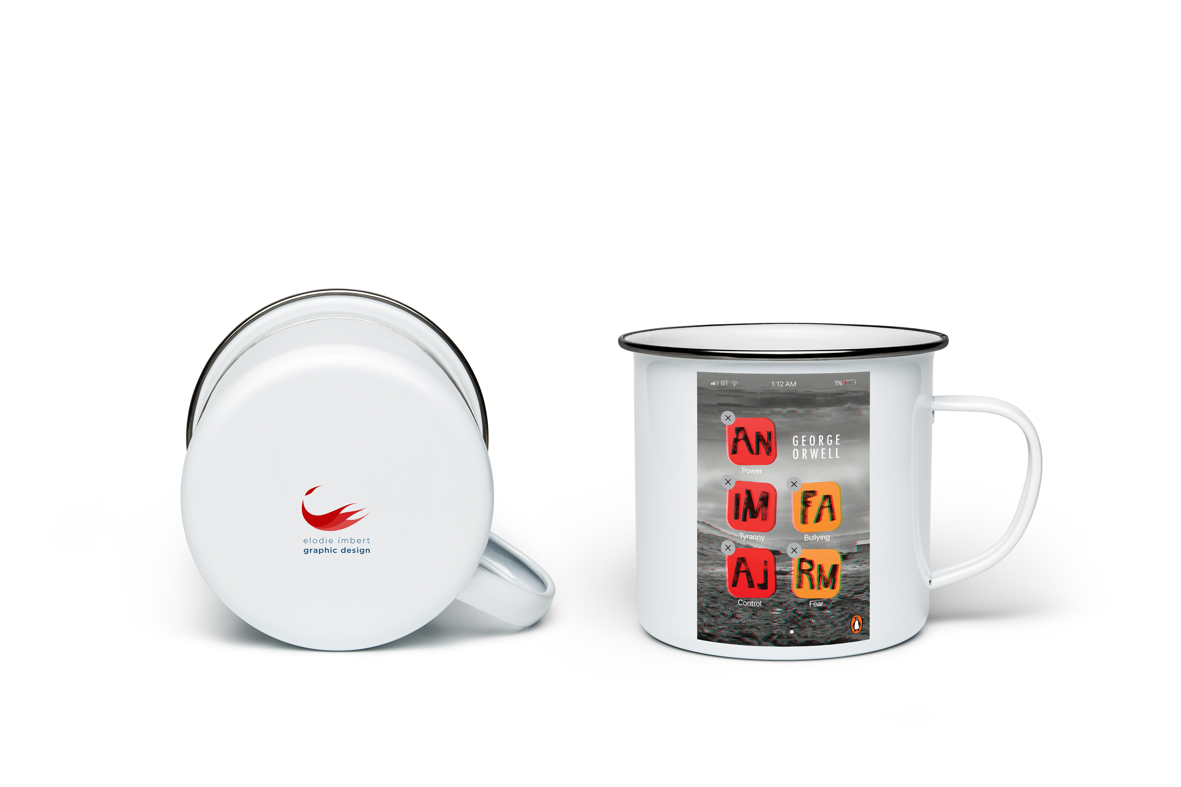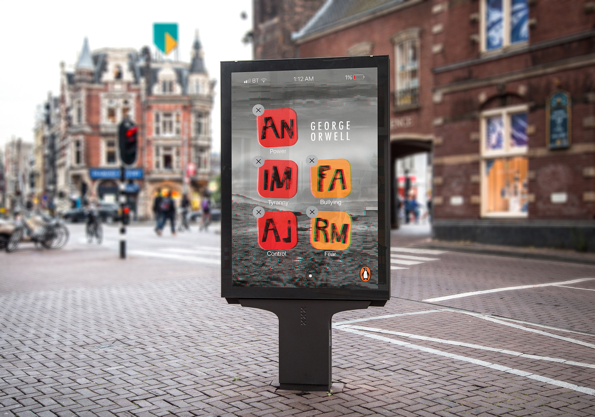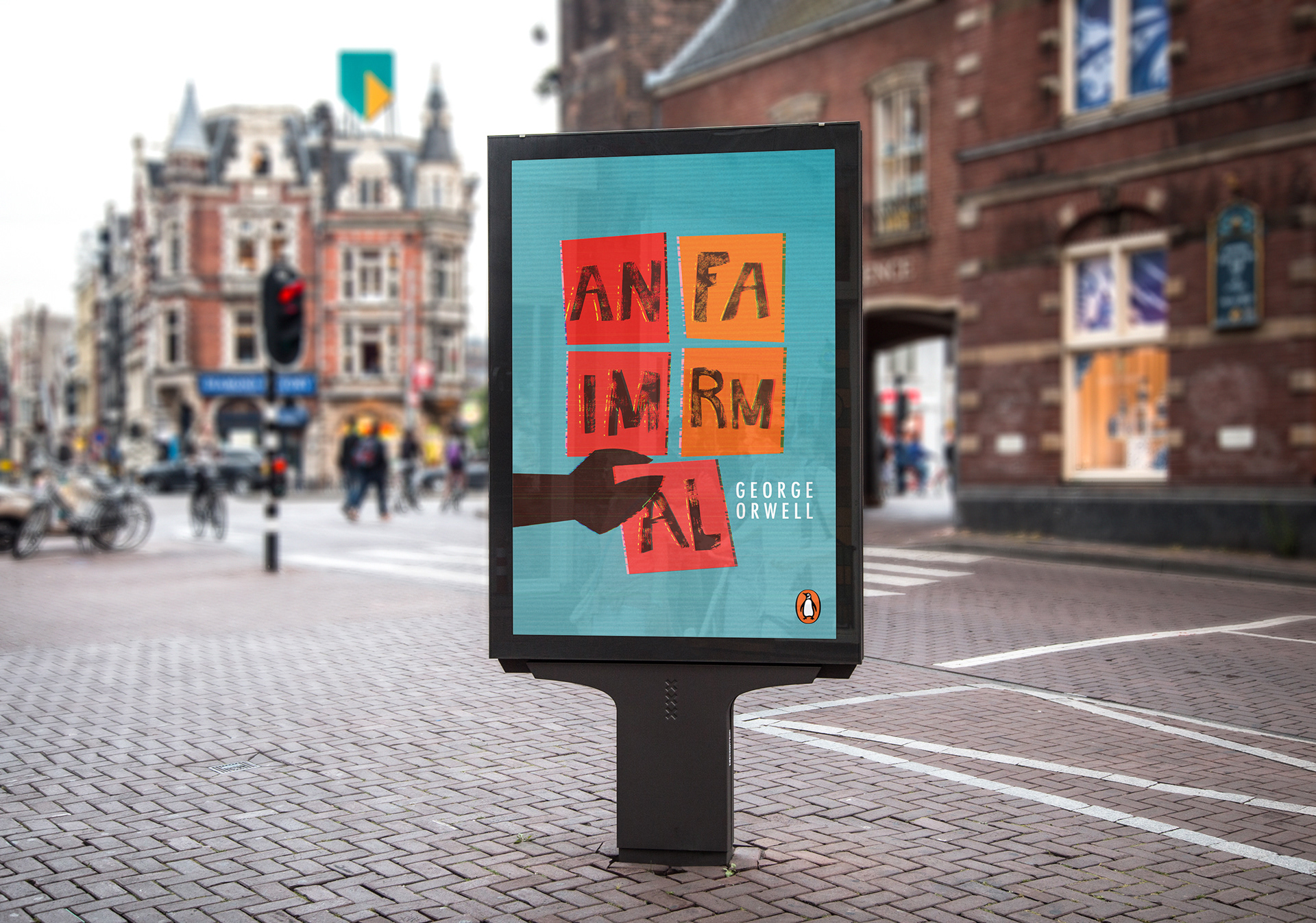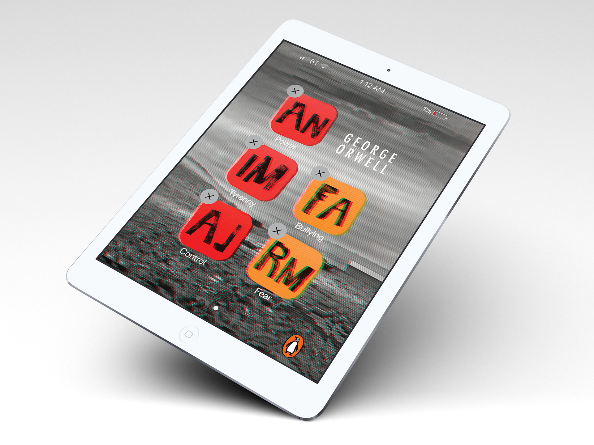 I was able to target the YA audience thanks to the following attributes, which I had isolated during the research process: large hand-rendered title and color contrasts (here, black and white versus strong colors), eye-catching tones, the use of typographic imagery and the conceptual approach of reproducing an app screen on the print cover. Using the glitch technique, a current design trend, further linked to the YA audience while communicating the satirical allegory and portrayal of Soviet totalitarianism portrayed throughout this world famous dystopian novel.