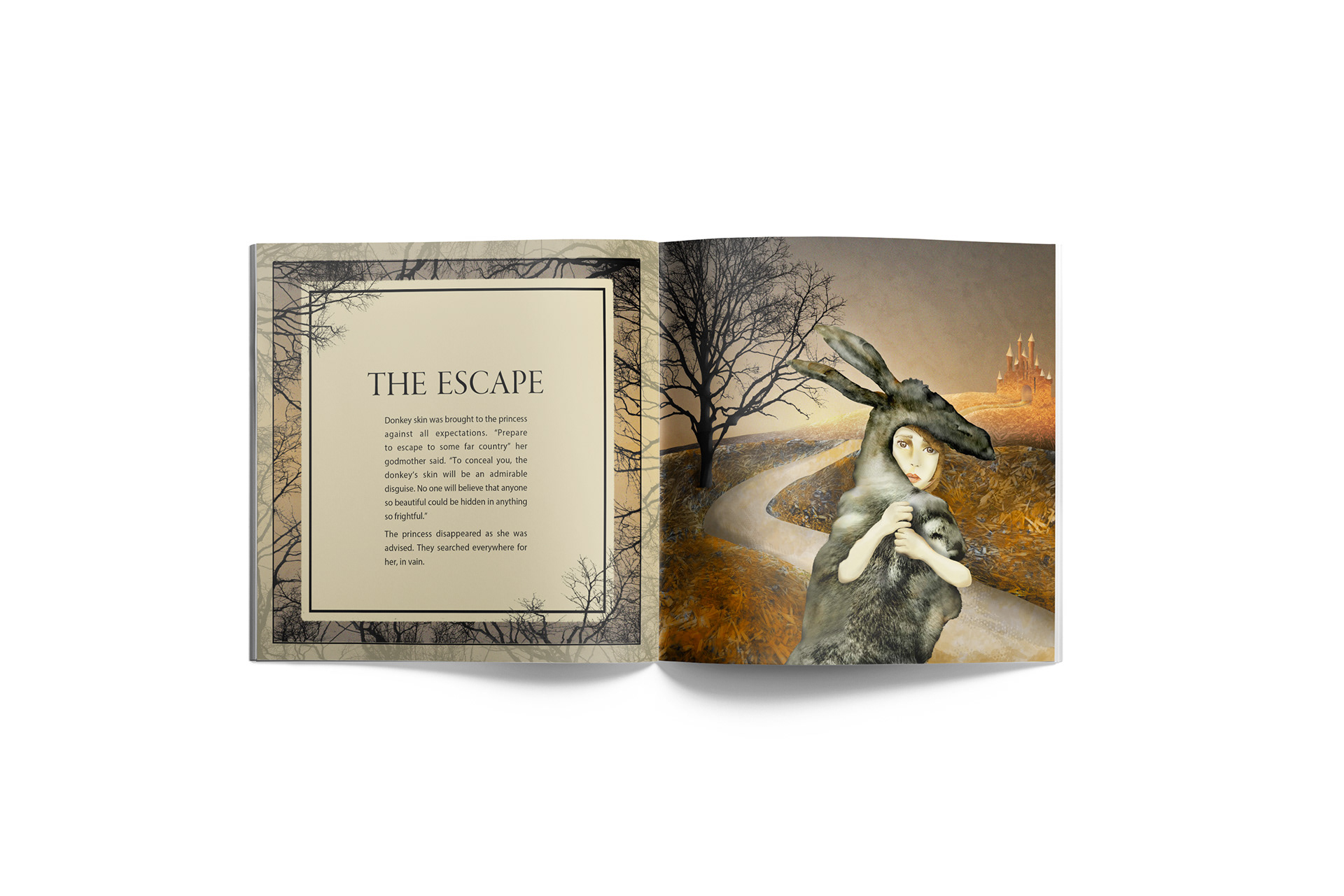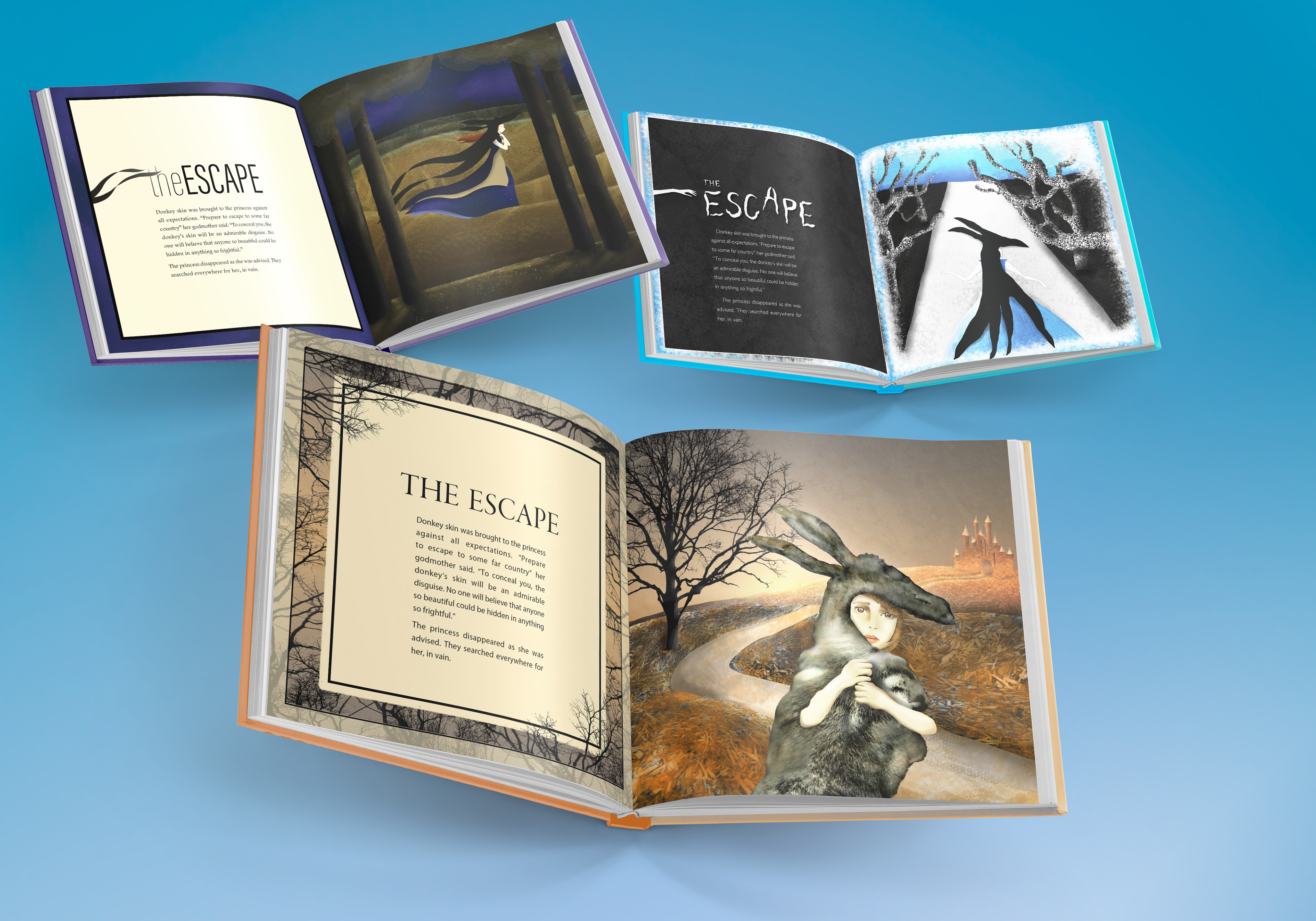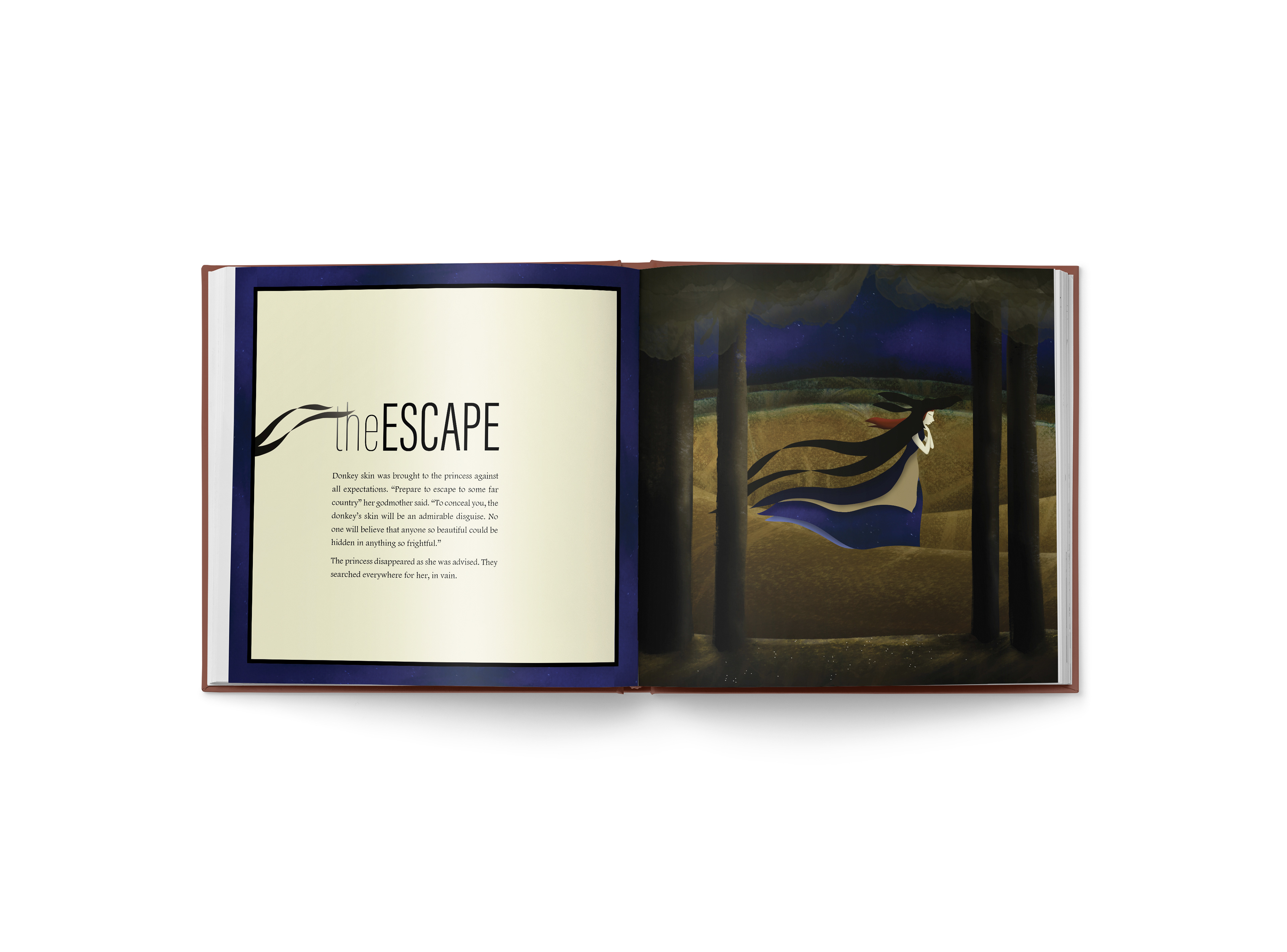 The client is a publishing company. The aim of the brief was to produce 3 alternate full page colour illustrations for one of the chapters of a folklore book. A French folktale penned by Charles Perrault, called Peau d'âne (Donkey Skin), was chosen to illustrate a chapter I titled The Escape.