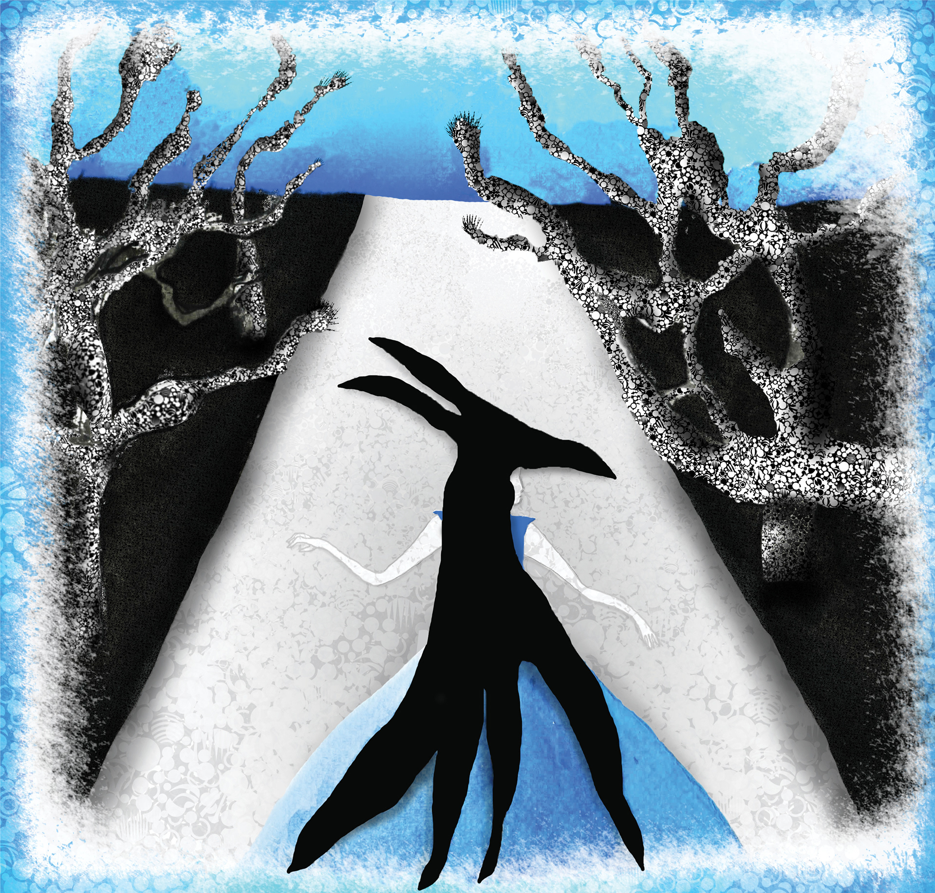One of my initial digital sketches (iPad Pro); the mix-media initial drawing (gouache and charcoal); a pattern created for the tree bark and path.