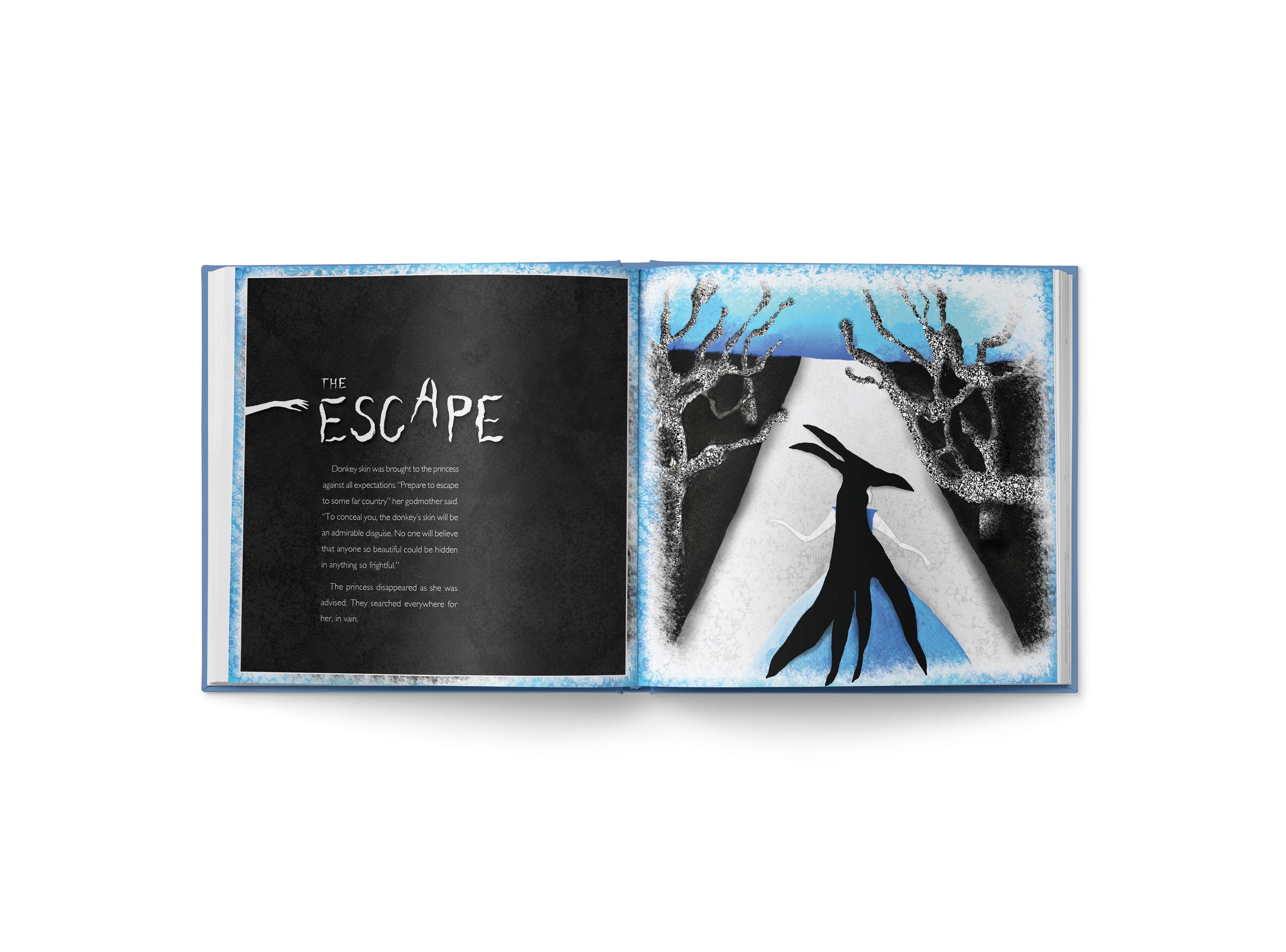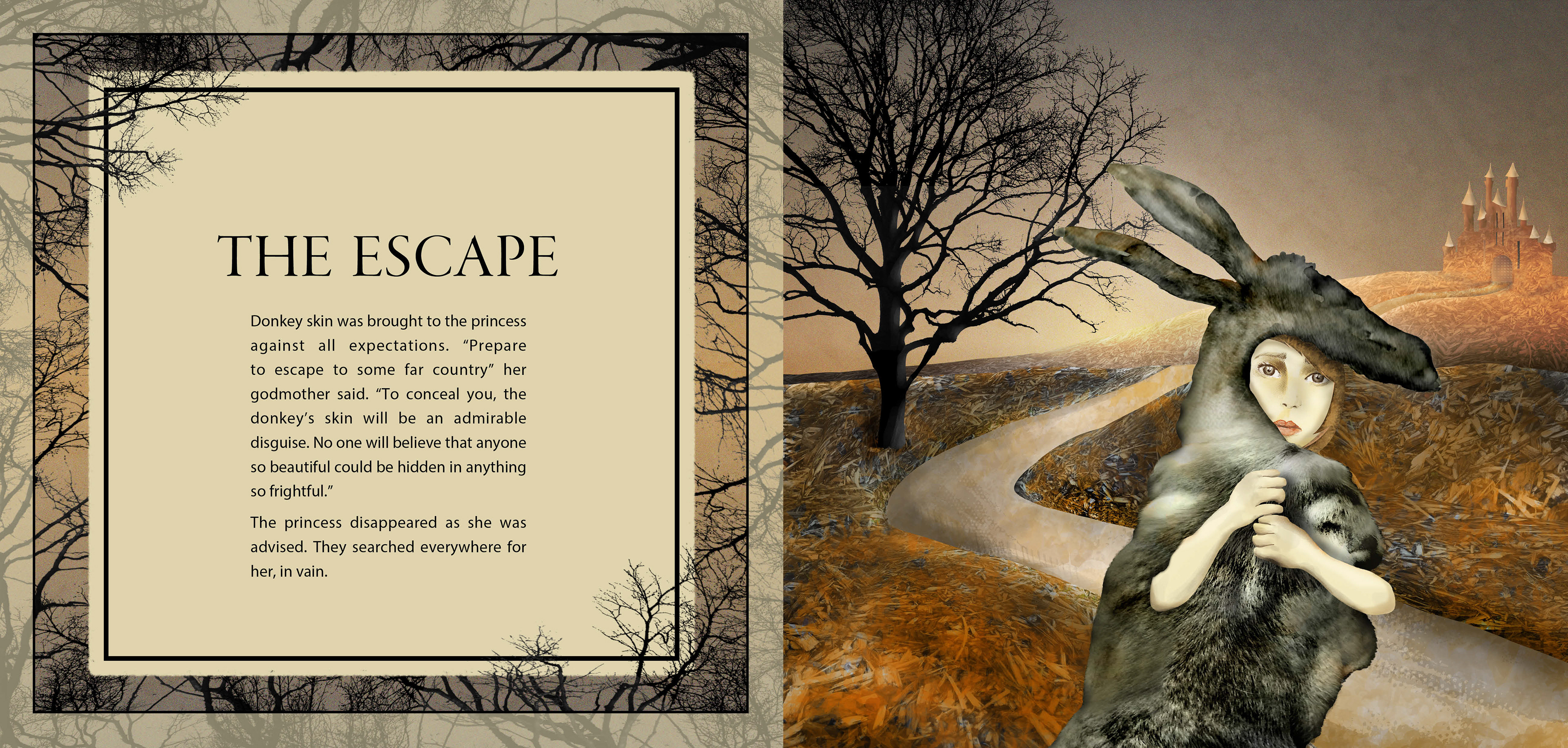 The client is a publishing company. The aim of the brief was to produce 3 alternate full page colour illustrations for one of the chapters of a folklore book. A French folktale penned by Charles Perrault, called Peau d'âne (Donkey Skin), was chosen to illustrate a chapter I titled The Escape.