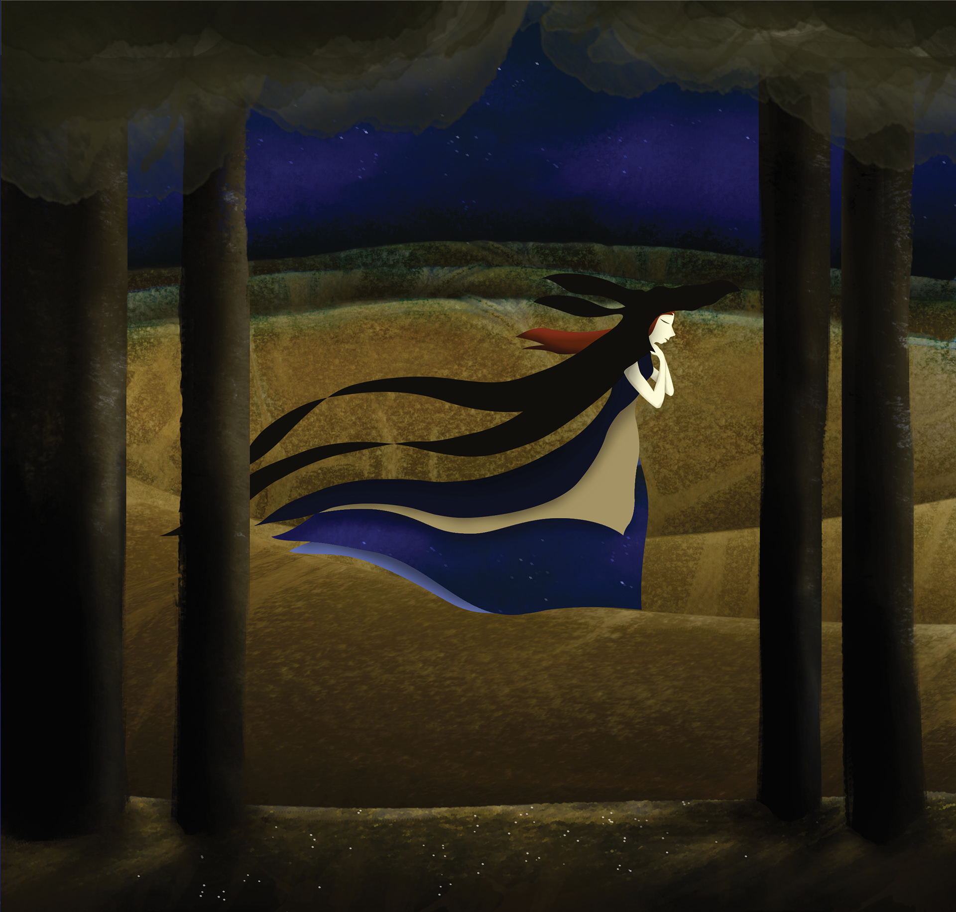 The illustration captures Donkey Skin as she flees the castle, worried that she might be captured, and equally worried about a very uncertain future.