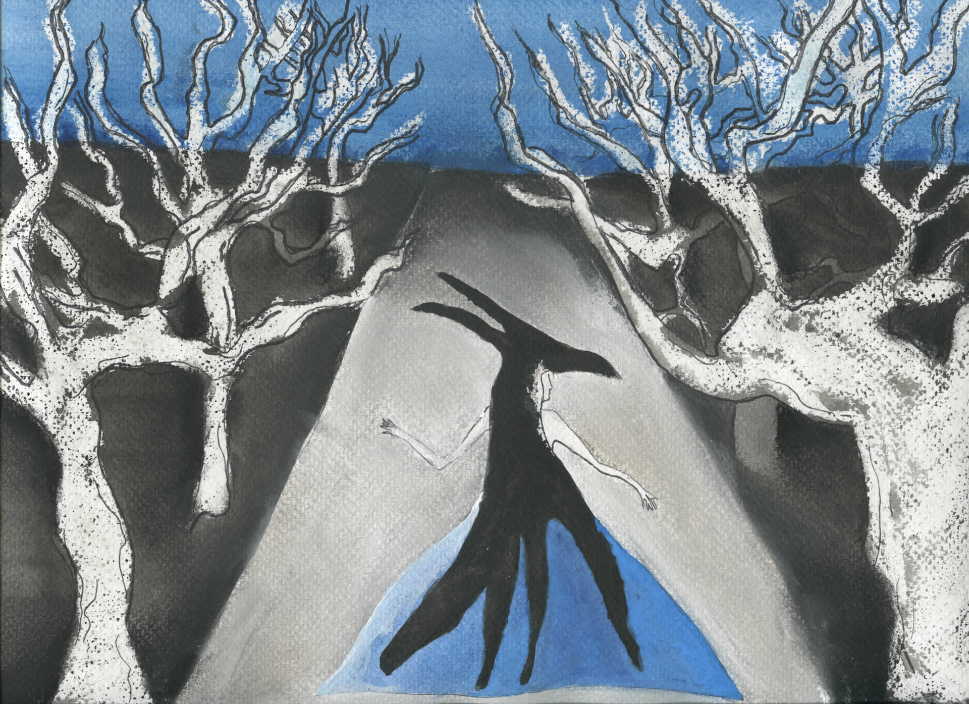 One of my initial digital sketches (iPad Pro); the mix-media initial drawing (gouache and charcoal); a pattern created for the tree bark and path.