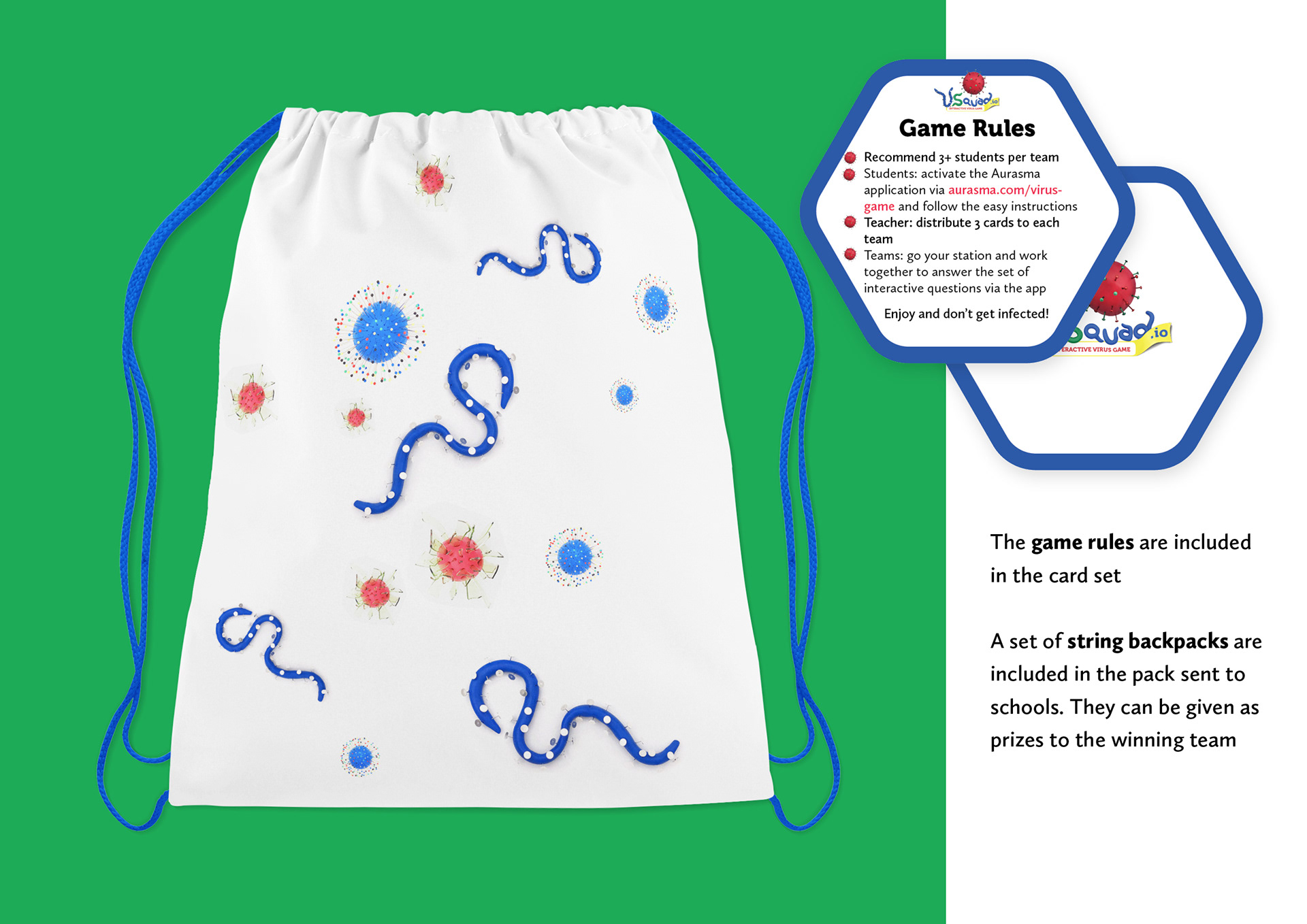 The resulting game is team-based and the winning team gets a prize (one string backpack each). Other perks are indicated on the box.