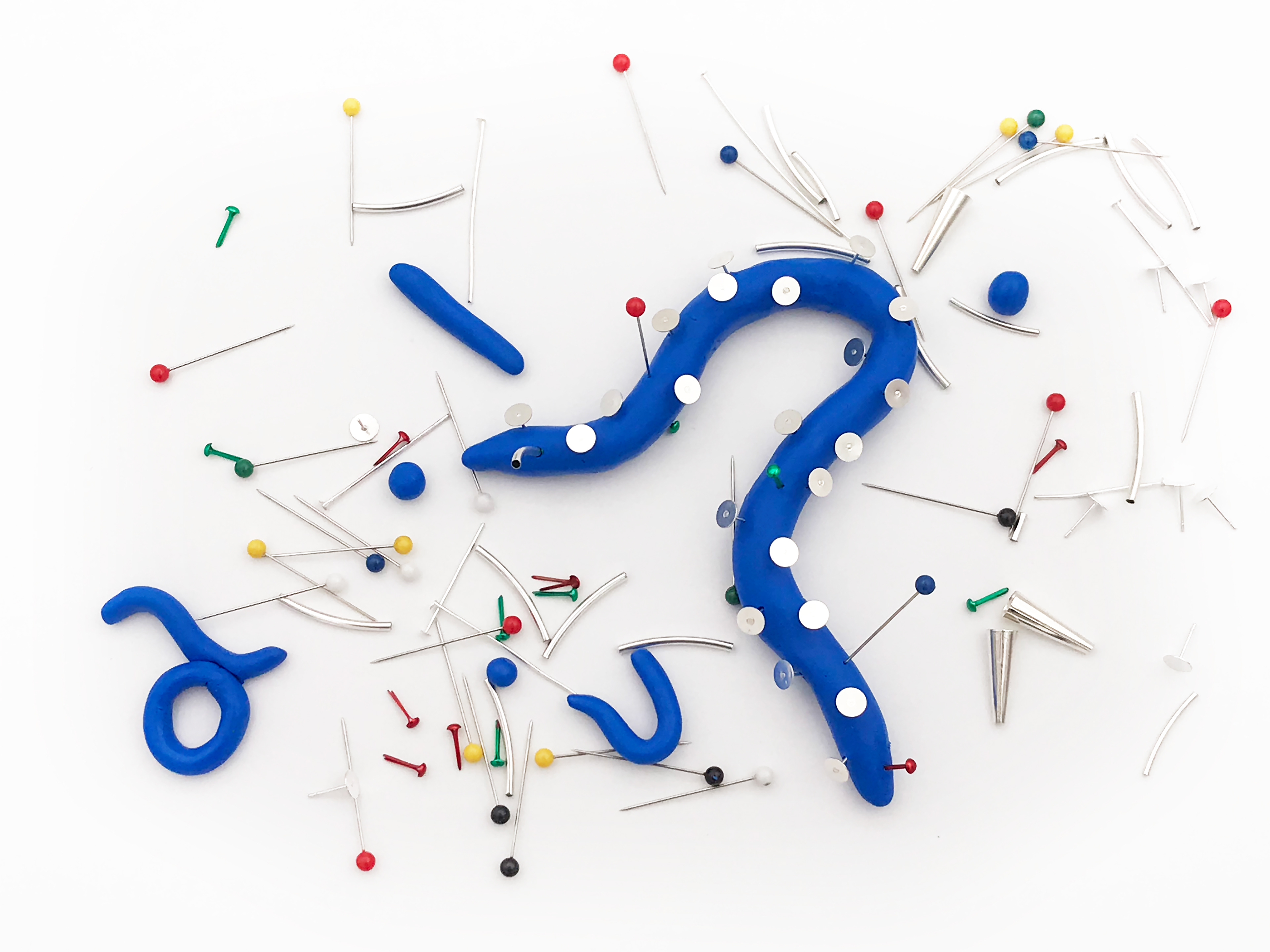 Some found objects used for the plasticine viruses: pins, earring stud settings and paper fasteners