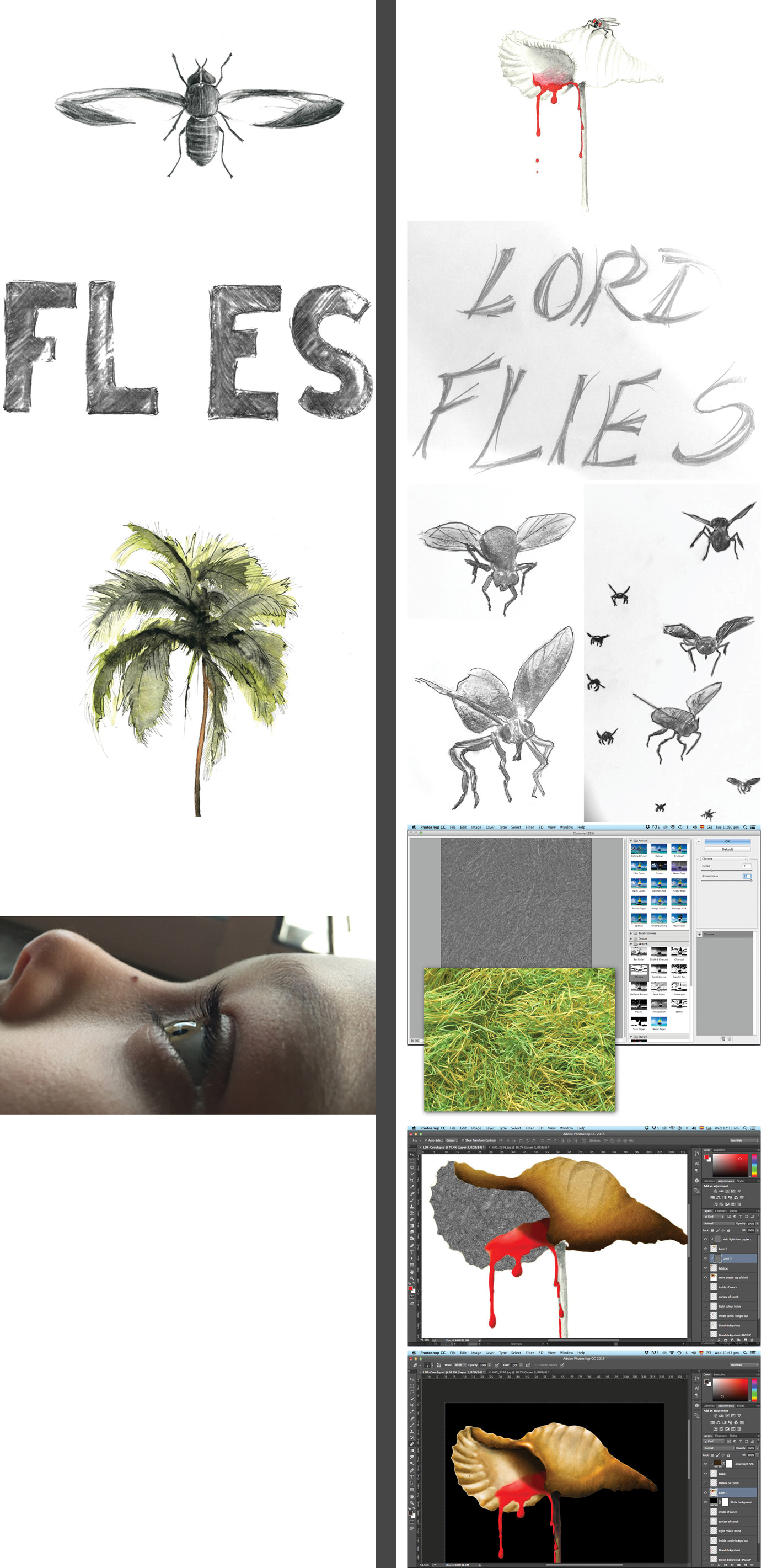 Below are some of the elements which were used to create the cover. The initial sketch of the conch from which blood is pouring out; the hand-rendered title meant to convey decay and confusion; the green paper hay used to texturise the flies, conch and background...