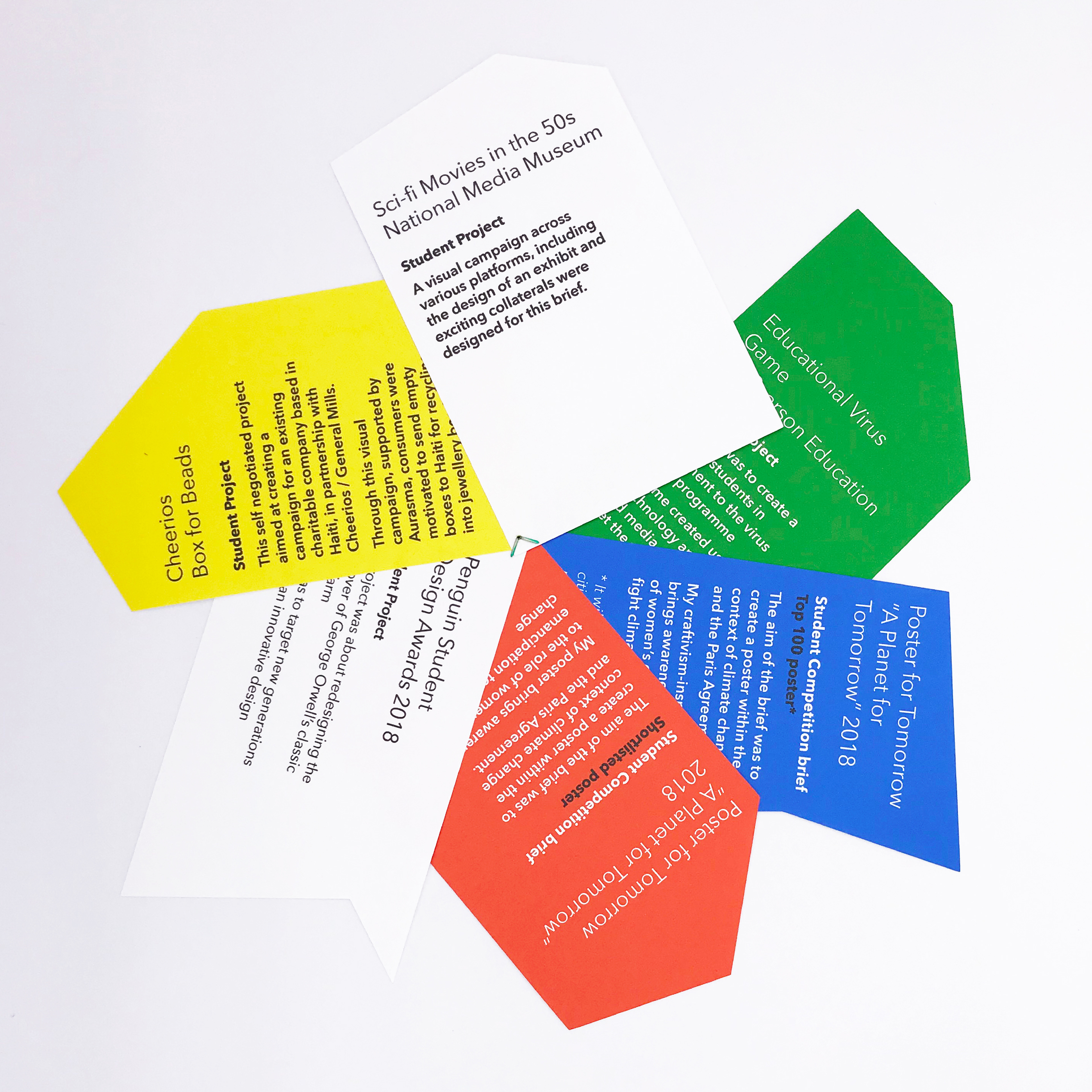A self-promotional pack was produced as part of this identity. The portfolio presentation was inspired by the colour swatch format while expressing my love for unconventional shapes and colour combinations.