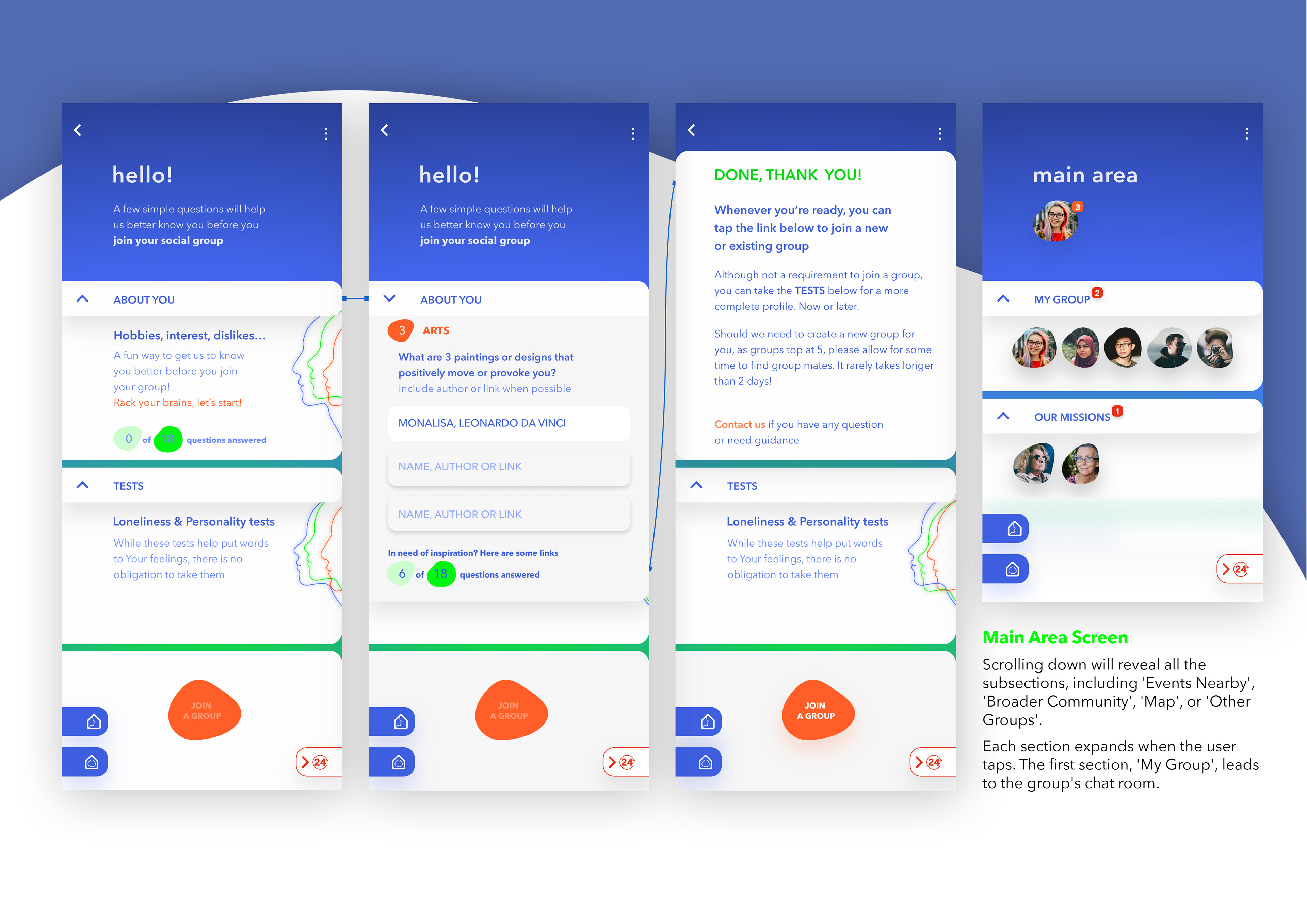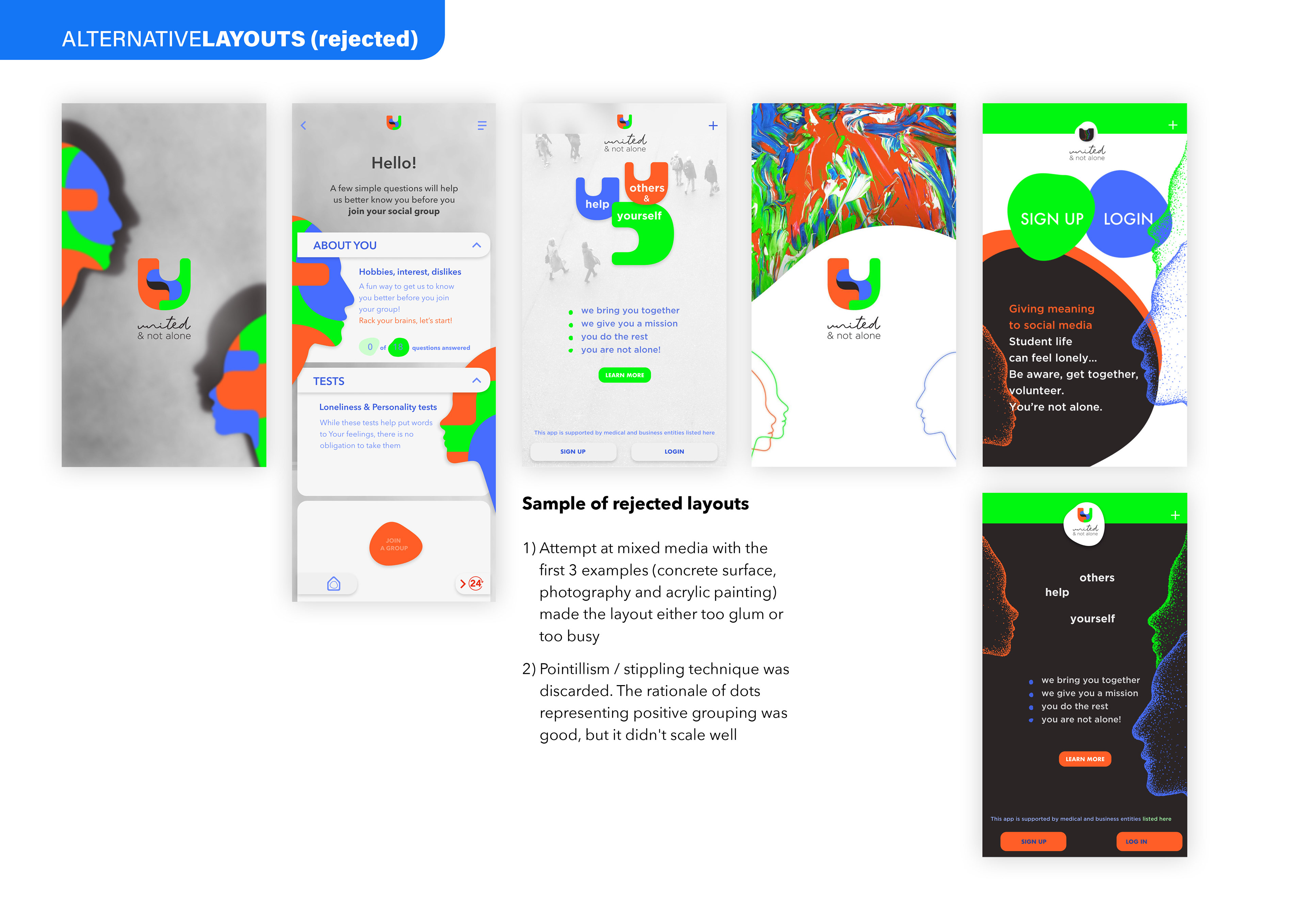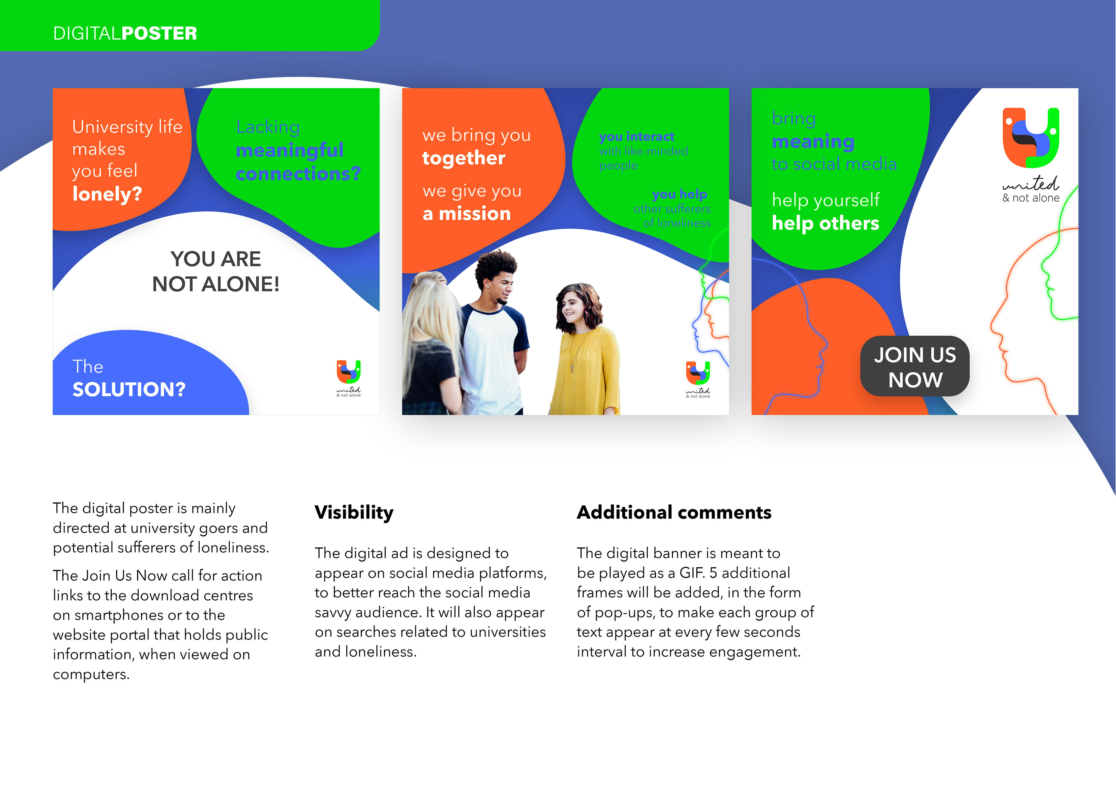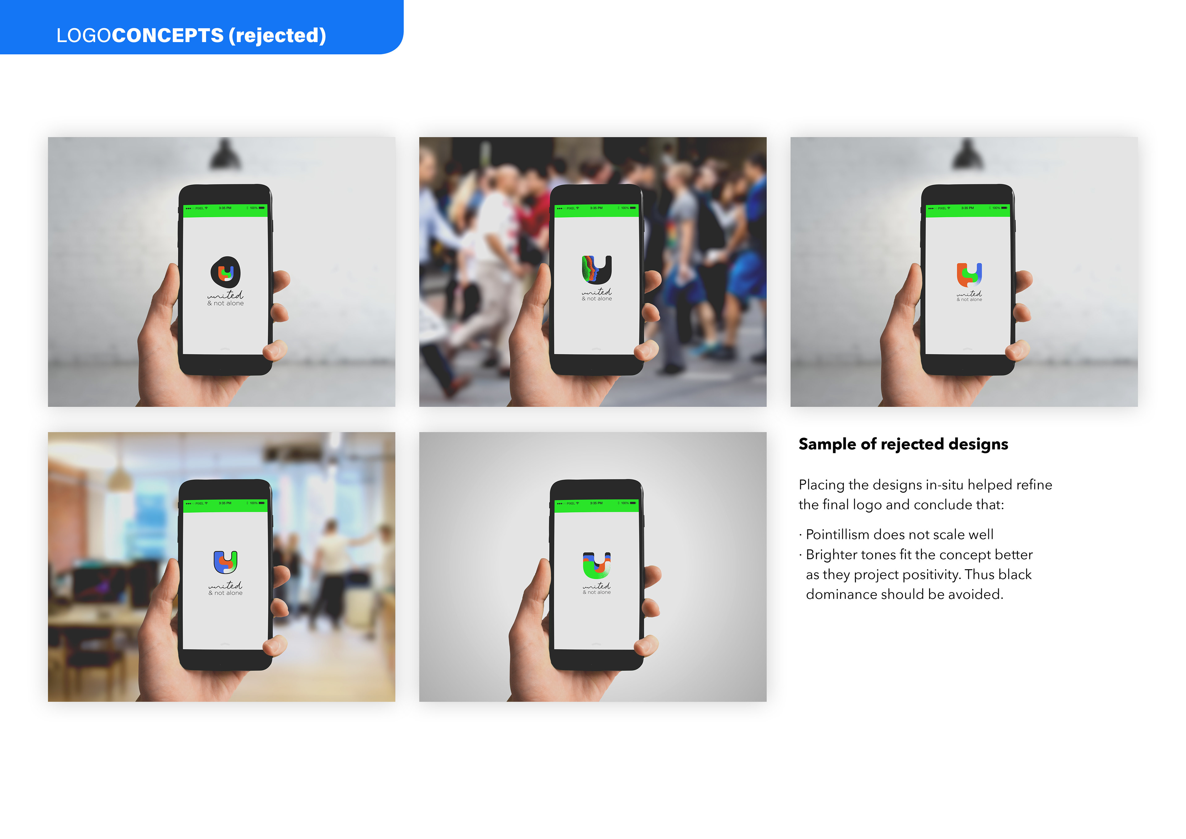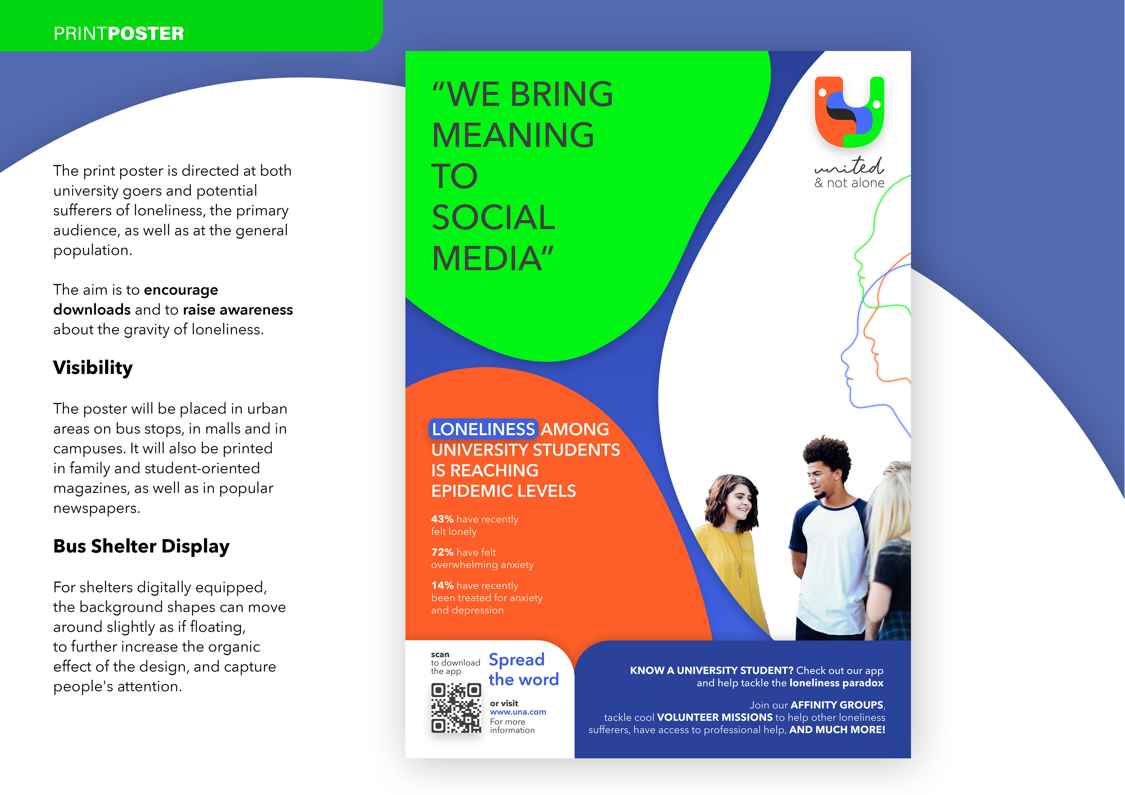 The chosen name United & Not Alone evokes the fact that people getting together are better equipped to fight loneliness. Two tag-lines are used intermittently. 'Help Yourself Help Others' communicates the second core intent of the application, volunteering to help other sufferers, such as seniors. 'Bringing Meaning to Social Media' promotes the organisation as an alternative to traditional social media, and as a way to reclaim real and valuable interactions.