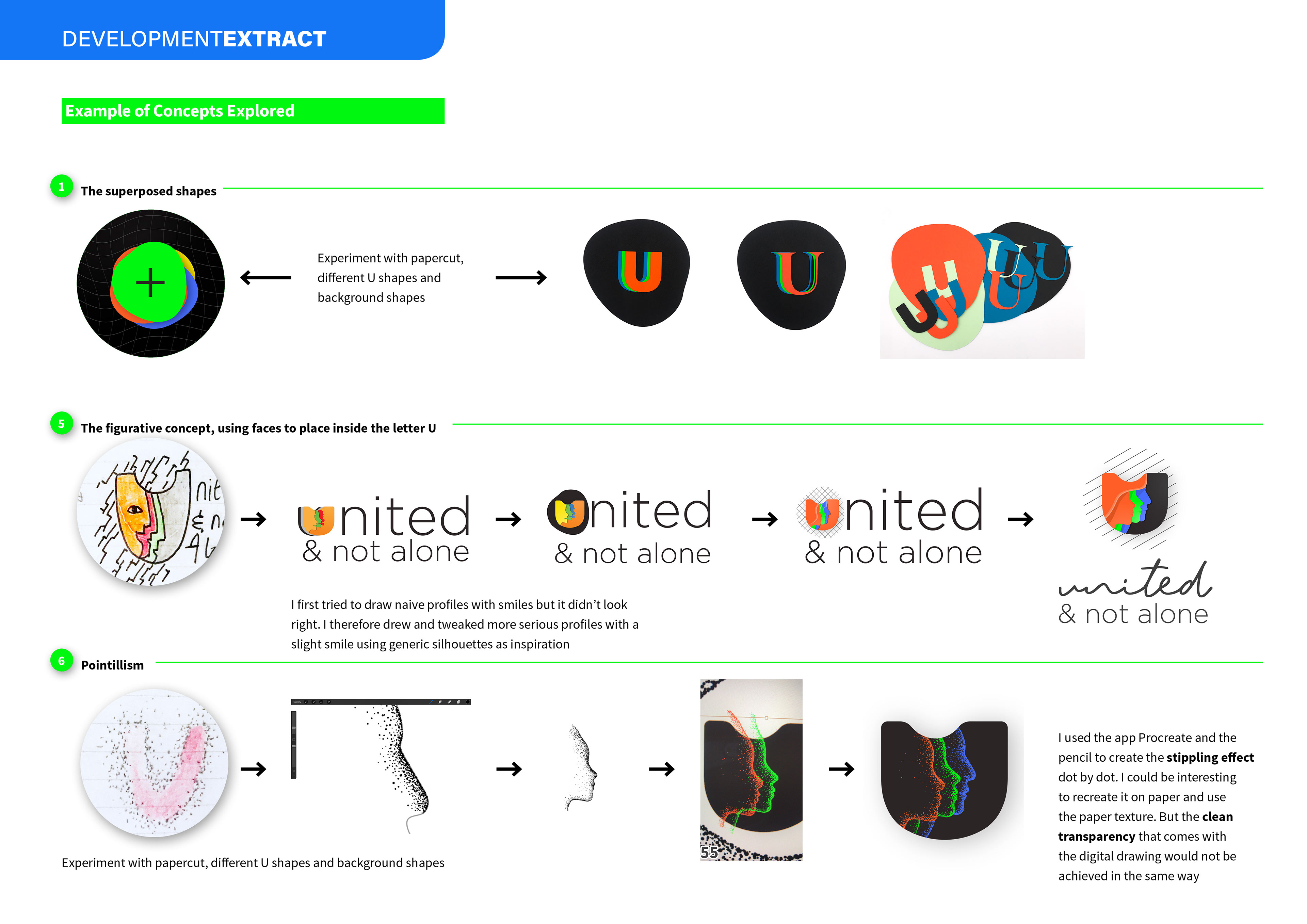 A quick look at the ideation and development processes, as well as some rejected concepts and visuals. This give a glimpse of the reasoning and inadequate choices I made along the way, before I arrived at my final solution