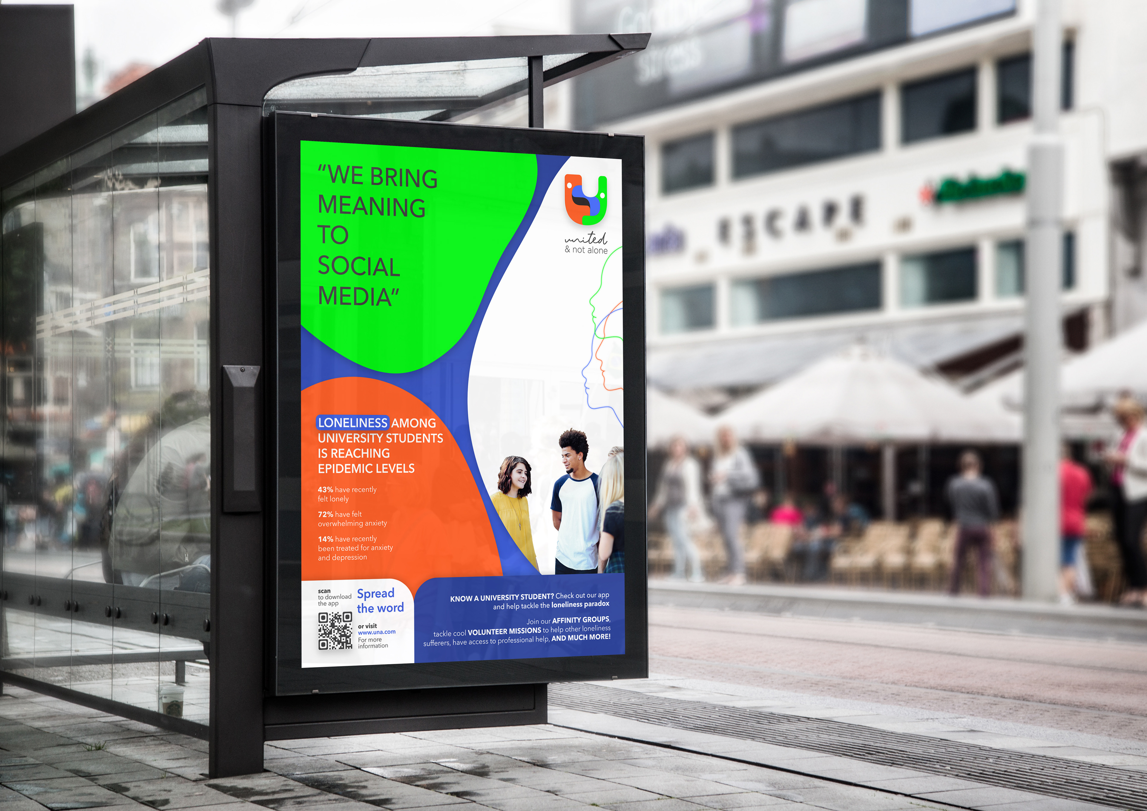 The logo was created on the premise that bonding and interaction will fight loneliness. It is formed by a stylised letter U with white dots, abstractly representing people, bonding and interaction.