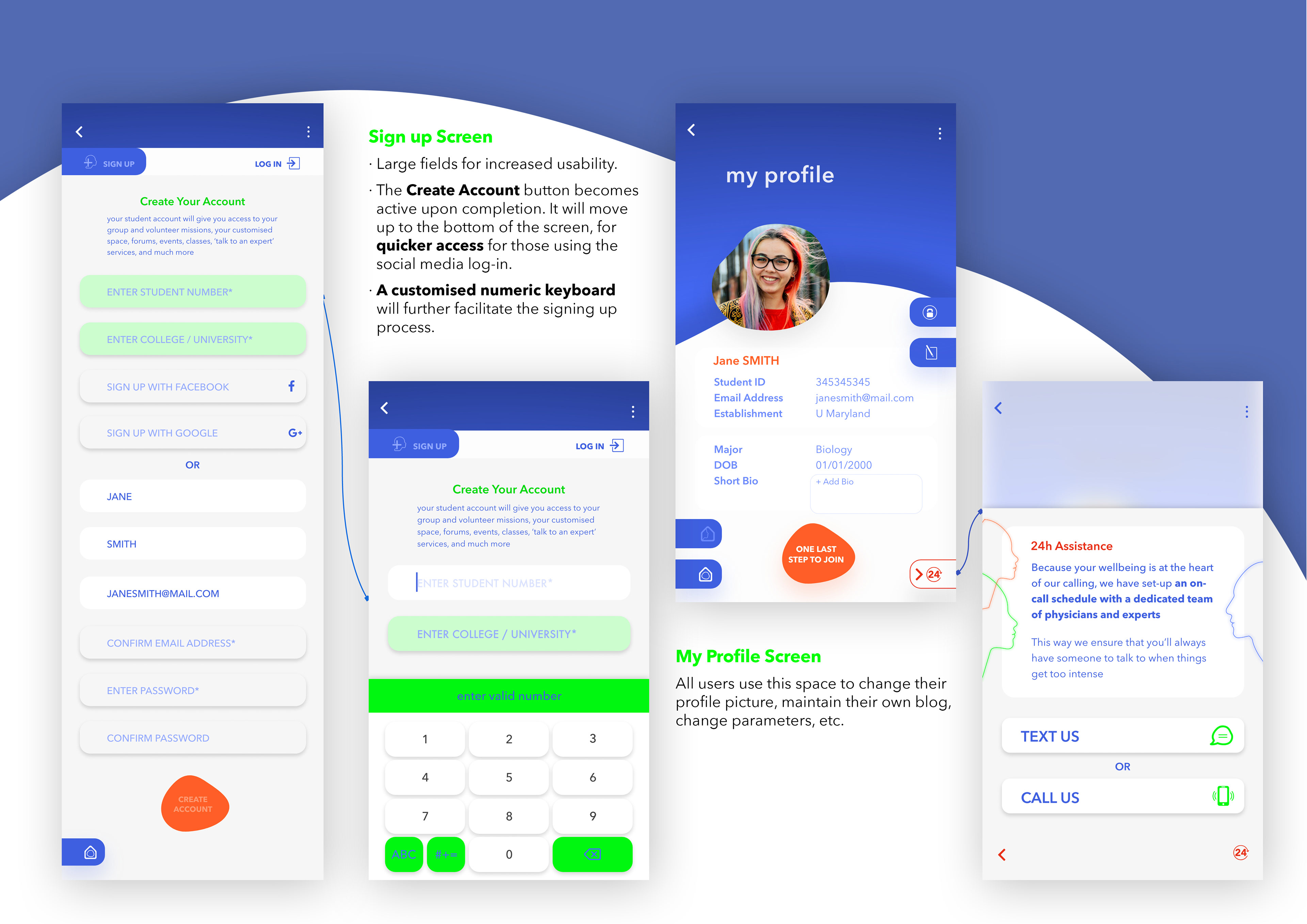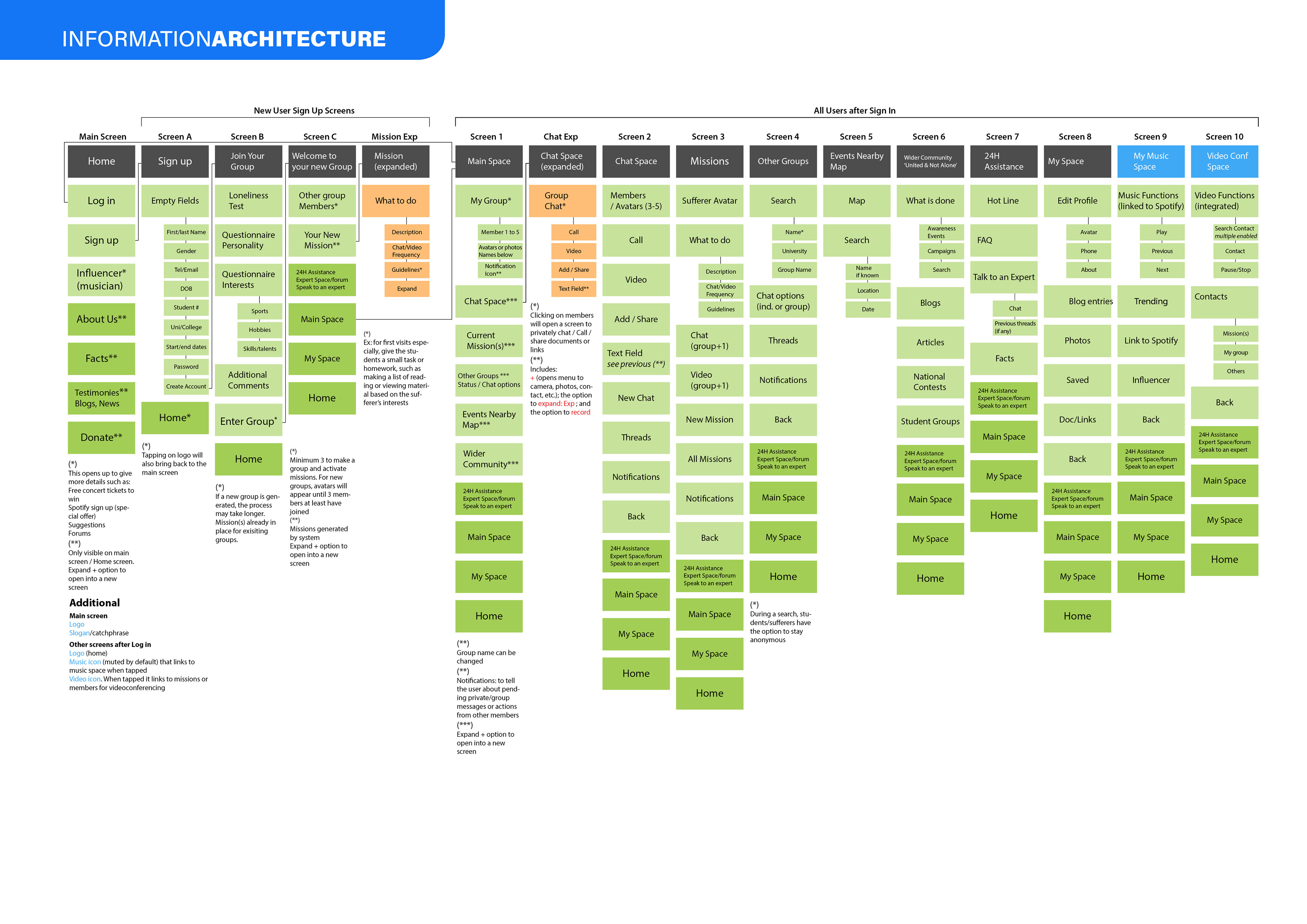 Two tag-lines are used intermittently. 'Help Yourself Help Others' communicates the second core intent of the application, volunteering to help other sufferers, such as seniors. 'Bringing Meaning to Social Media' promotes the organisation as an alternative to traditional social media, and as a way to reclaim real and valuable interactions.