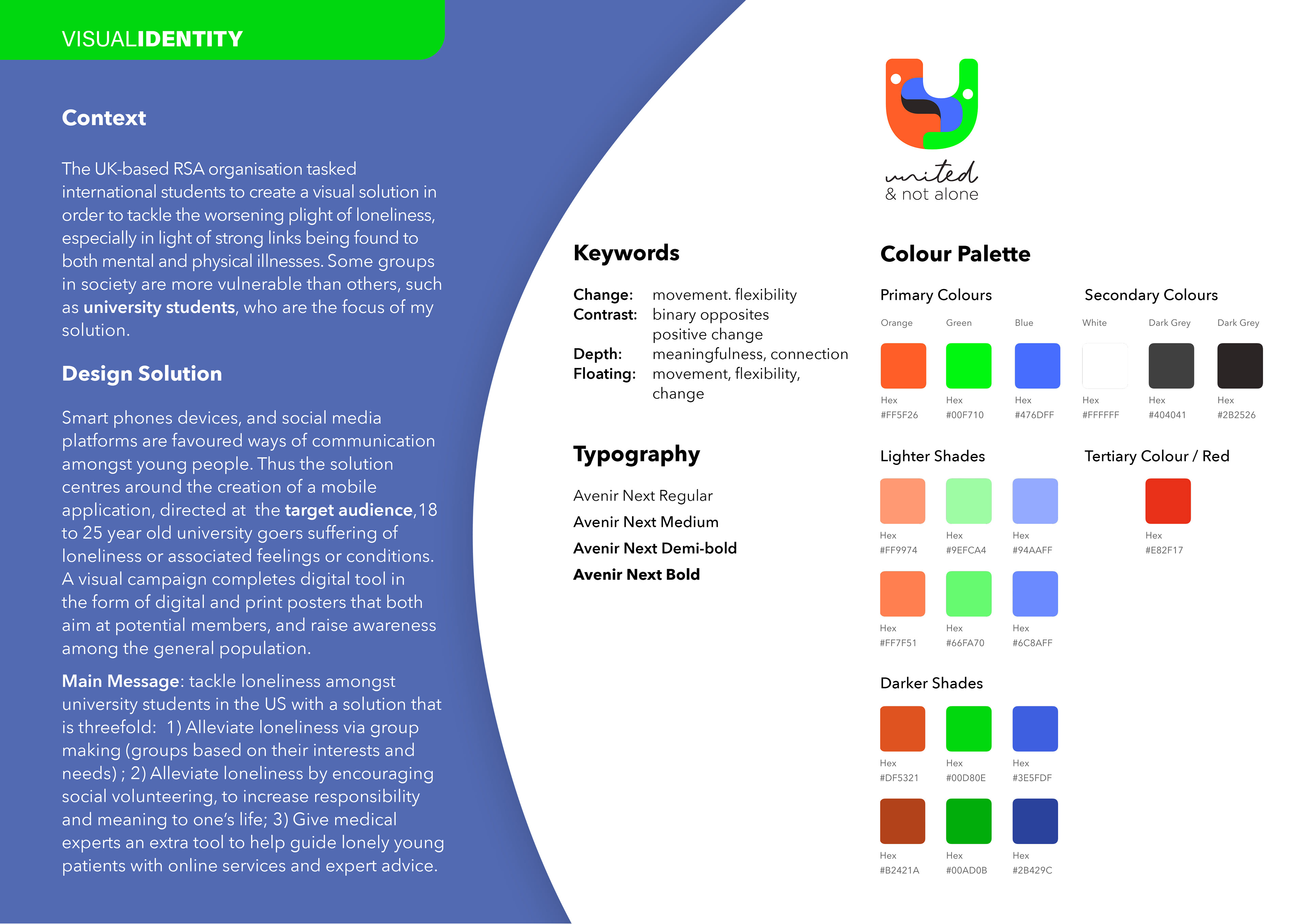 A bright combination of colours is used across the branding. Orange is often associated with youth, enthusiasm and positivity. Green is a colour that soothes and reassures, while suggesting renewal and growth. And the colour blue is essentially that of knowledge and expertise. The bright coloured shapes represent loneliness sufferers forming a protective hug, while the swallowed black shape represents loneliness itself, or the damaging structures of society.