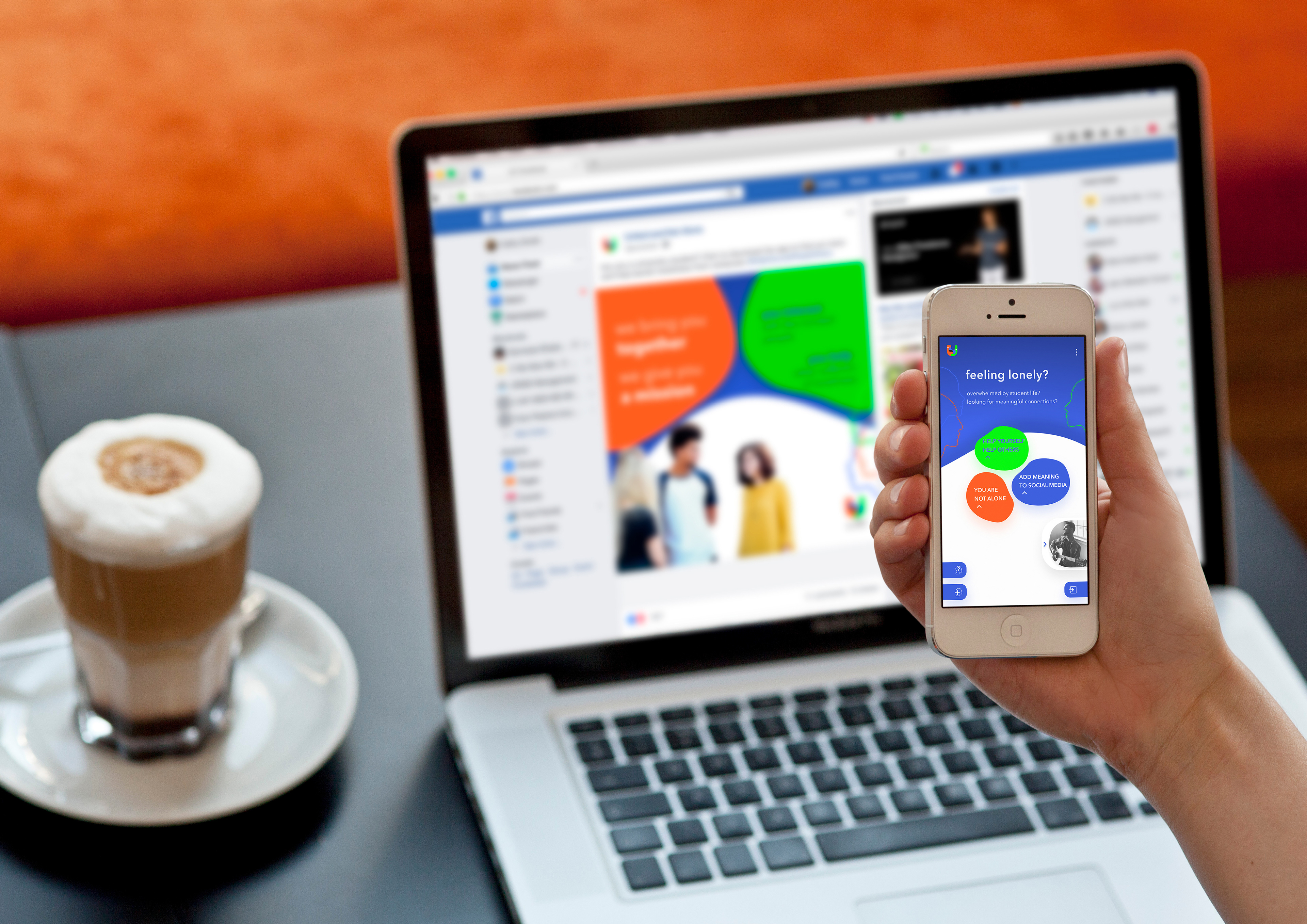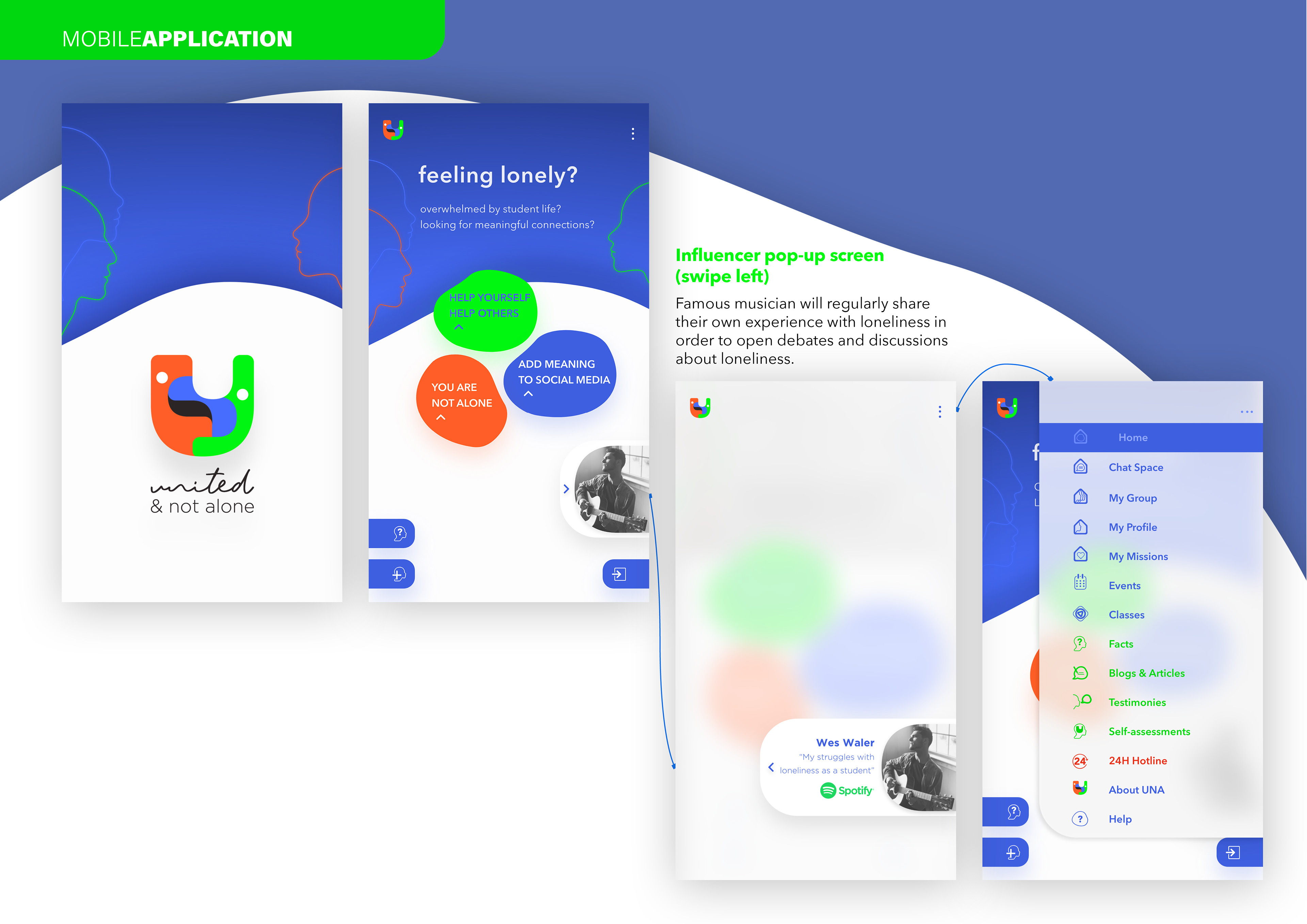 The neon coloured lined faces are a fixed component of the organisation's branding and appear on both the print and digital platforms. They represent loneliness sufferers but they also act as protectors, adding a soft human touch to the application. The inclusion of an influencer, a personality that the audience admires, is meant to increase awareness, visibility, and access to testimonies and other's experiences of loneliness.